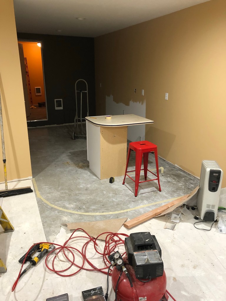 Installed the wood flooring. Cabinets installed from Home Depot.